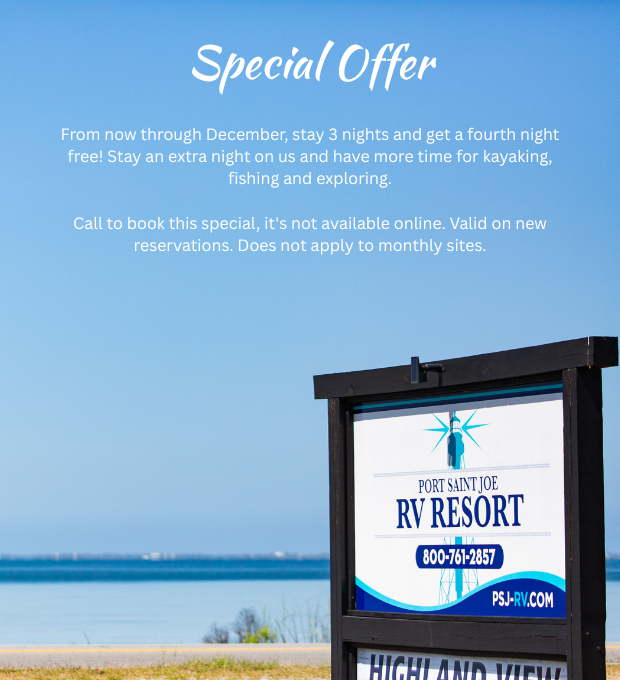 Every moment at our Port Saint Joe RV Park is an opportunity to create lasting memories. Whether you’re seeking a peaceful retreat or an action-packed getaway, our RV park caters to all desires. We invite you to join us and experience the unparalleled beauty and tranquility of Florida’s Gulf Coast – a place where every sunset is a celebration, and every sunrise brings new adventures.